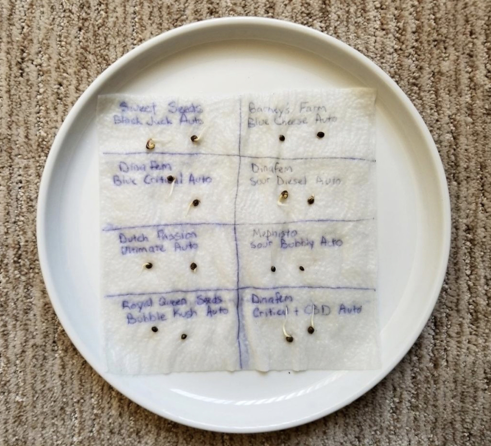 - 湿ったキッチンペーパーのうちの2枚をタッパーの底(お皿)に敷 きます。次に、大麻種子を最低3cmの間隔で並べ、残りの2枚の湿ったキッチン ペーパーを上に被せます。